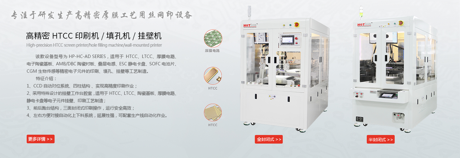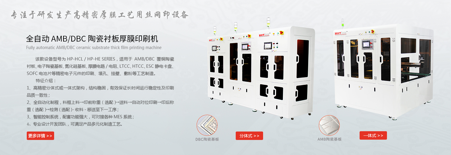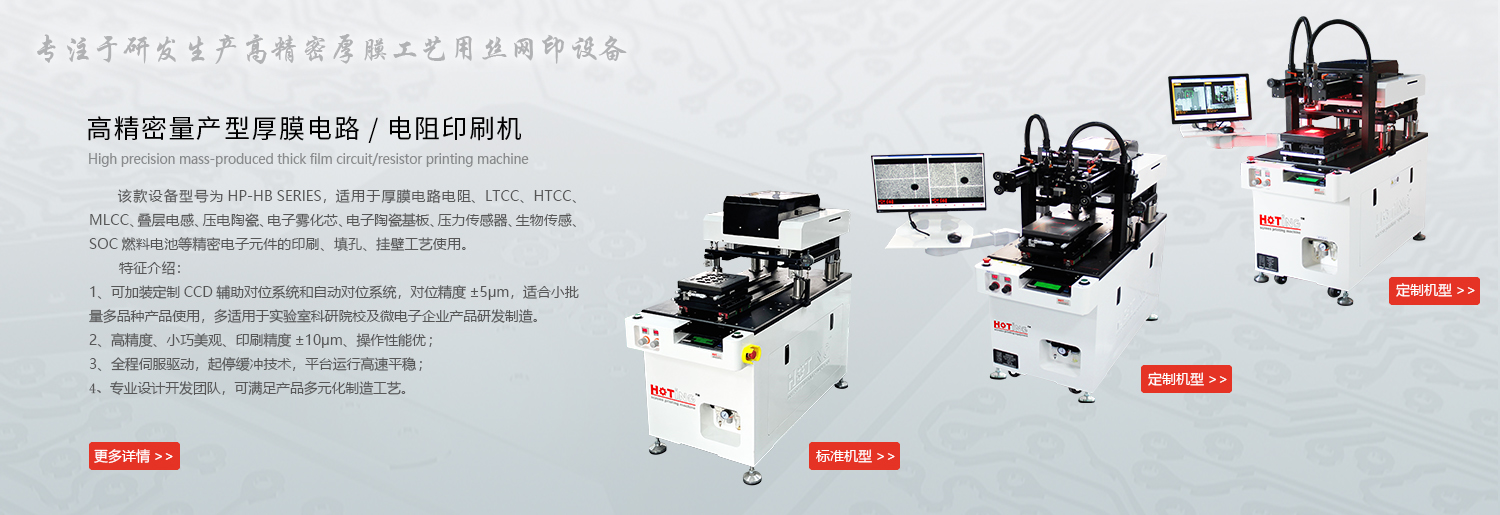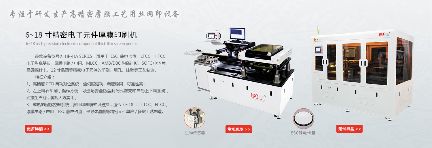 上海煊廷丝印设备有限公司本届展会将展示高精密自动化厚膜印刷设备,该系列设备亮点为:高精密自动化印刷作业模式、印刷精度高,印刷效率快,性能稳定,操作便捷,外形美观大方。同时我们公司所有设备也可按照客户要求开发定制,以满足不同客户的产品工艺和个性化需求。该系列设备广泛应用于LTCC、MLCC、HTCC、厚膜电路、AMB陶瓷基板、电子陶瓷基板、电子雾化芯、陶瓷发热元件、介质滤波器、压电陶瓷、SOFC电池片、厚膜传感器(汽车\军事\航天\医疗应用)等电子元器件的表面印刷、填孔、通孔相关工艺制造,其承印物可以是陶瓷、金属、硅片、薄膜、玻璃、石英或塑料等各种材料。煊廷诚邀各位朋友莅临参观指导交流,展位号: 7.2F509 ,欢迎行业朋友来厂参观考察!煊廷愿与各位一起共同推动行业发展而努力!