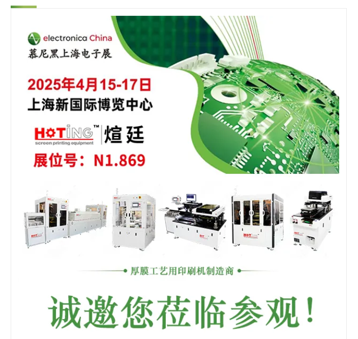 慕尼黑上海电子展将于2025年4月15-17日在上海新国际博览中心举办。展会设立半导体、传感器、电源、半导体智造、无源器件、显示、连接器、开关、线束线缆、印刷电路板等行业展区,届时,上海煊廷丝印设备有限公司将展示多款厚膜工艺用丝网印刷设备,其主要特征为:全自动操作制程、自动化印刷作业模式、印刷精度高、印刷效率快、性能稳定、操作便捷、外形美观大方。广泛应用于厚膜集成电路、电阻、电容、电感、陶瓷基板、传感器、光伏电池、SOFC电池片等电子元件的表面印刷、填孔、挂壁、通孔、敷粉等相关工艺制造,其承印物可以是陶瓷、金属、硅片、薄膜、玻璃、石英或塑料等各种材料。